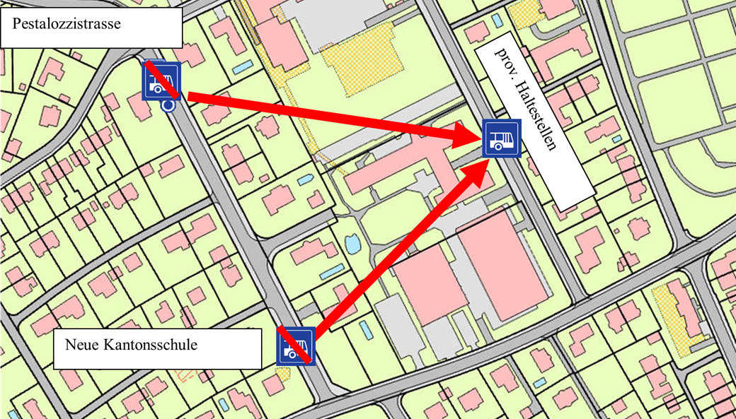 Es werden eine Ersatzhaltestellen an der Schanzmättelistrasse, auf Höhe des Schulhauses der Neuen Kantonschule eingerichtet.